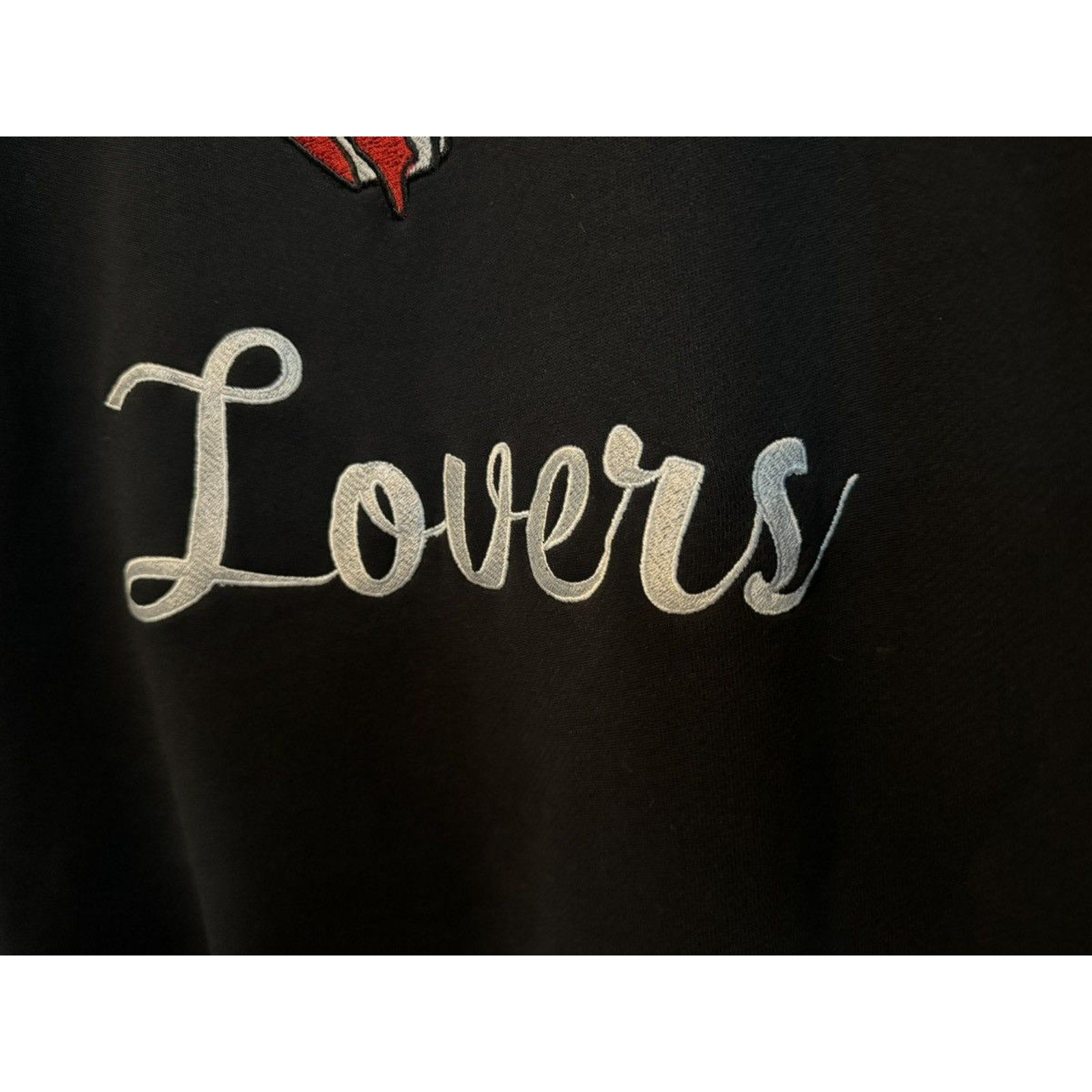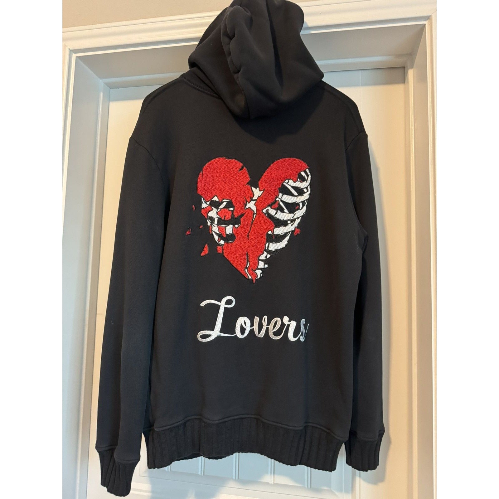 “Lovers” and a large red, black, and white broken heart embroidered on the back.
