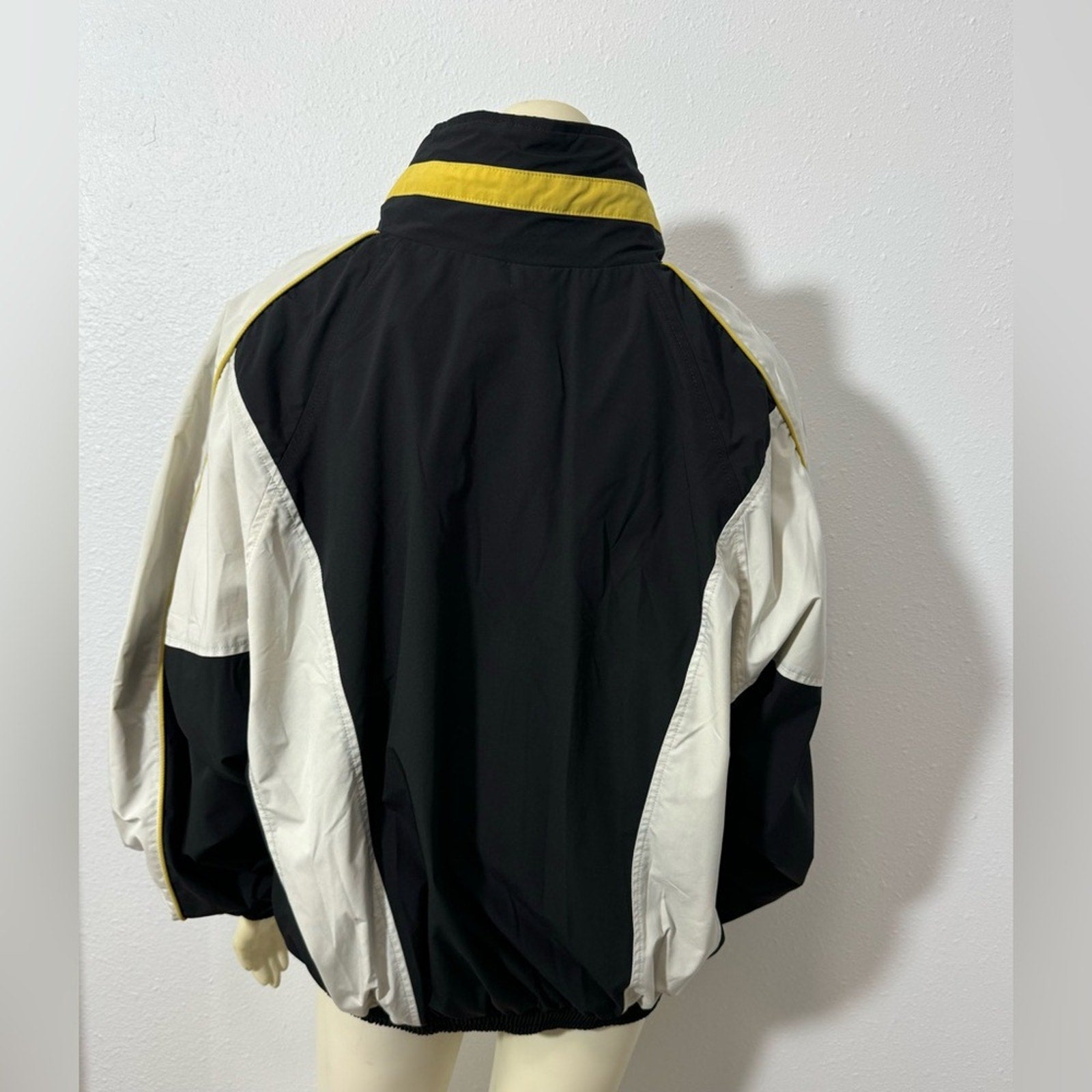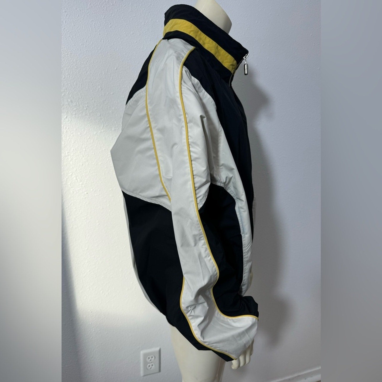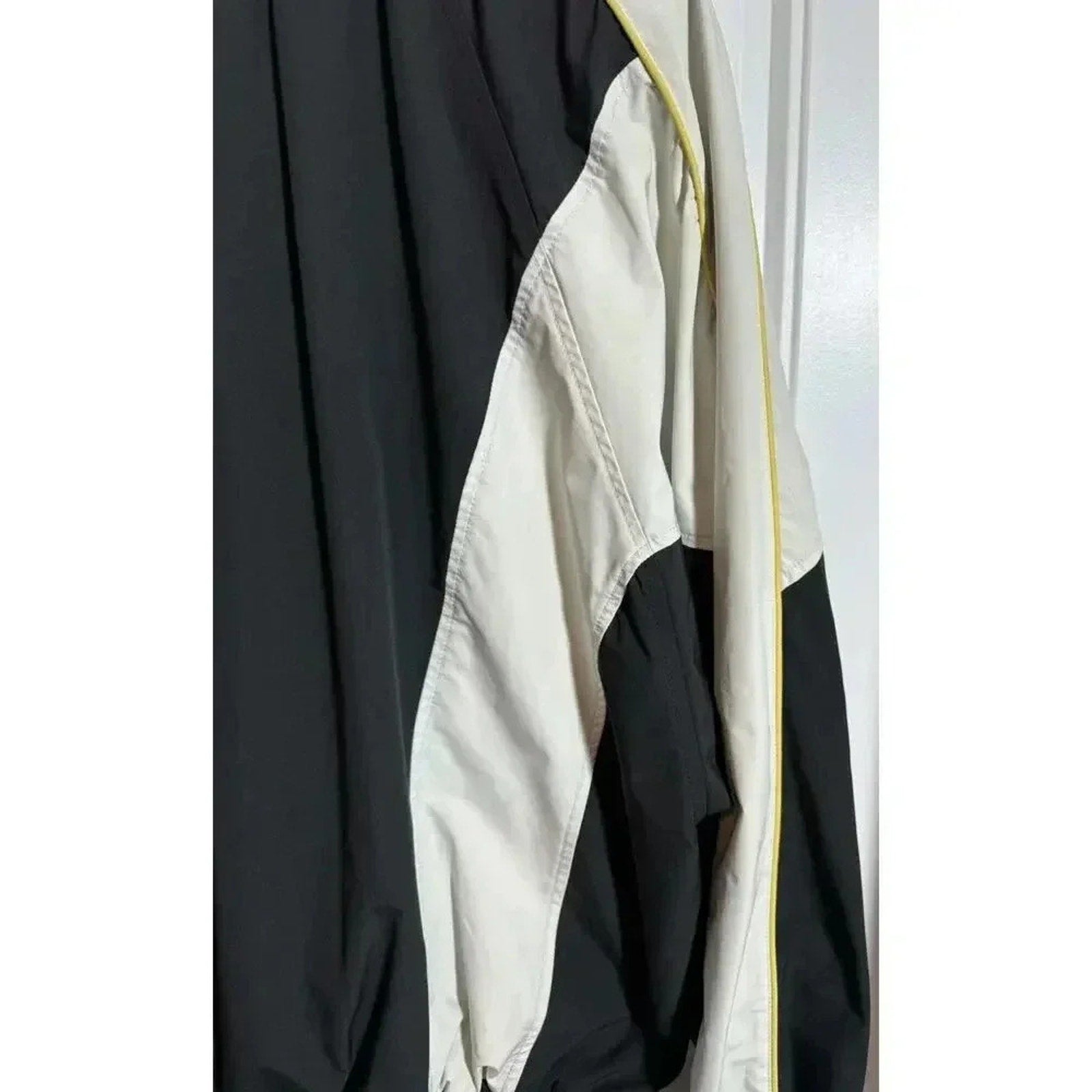 Color-blocked funnel-neck jacket from RHUDE featuring black/white, yellow, colour-block design, stripe detailing, funnel neck, front zip fastening, long sleeves, elasticated cuffs and elasticated hem.