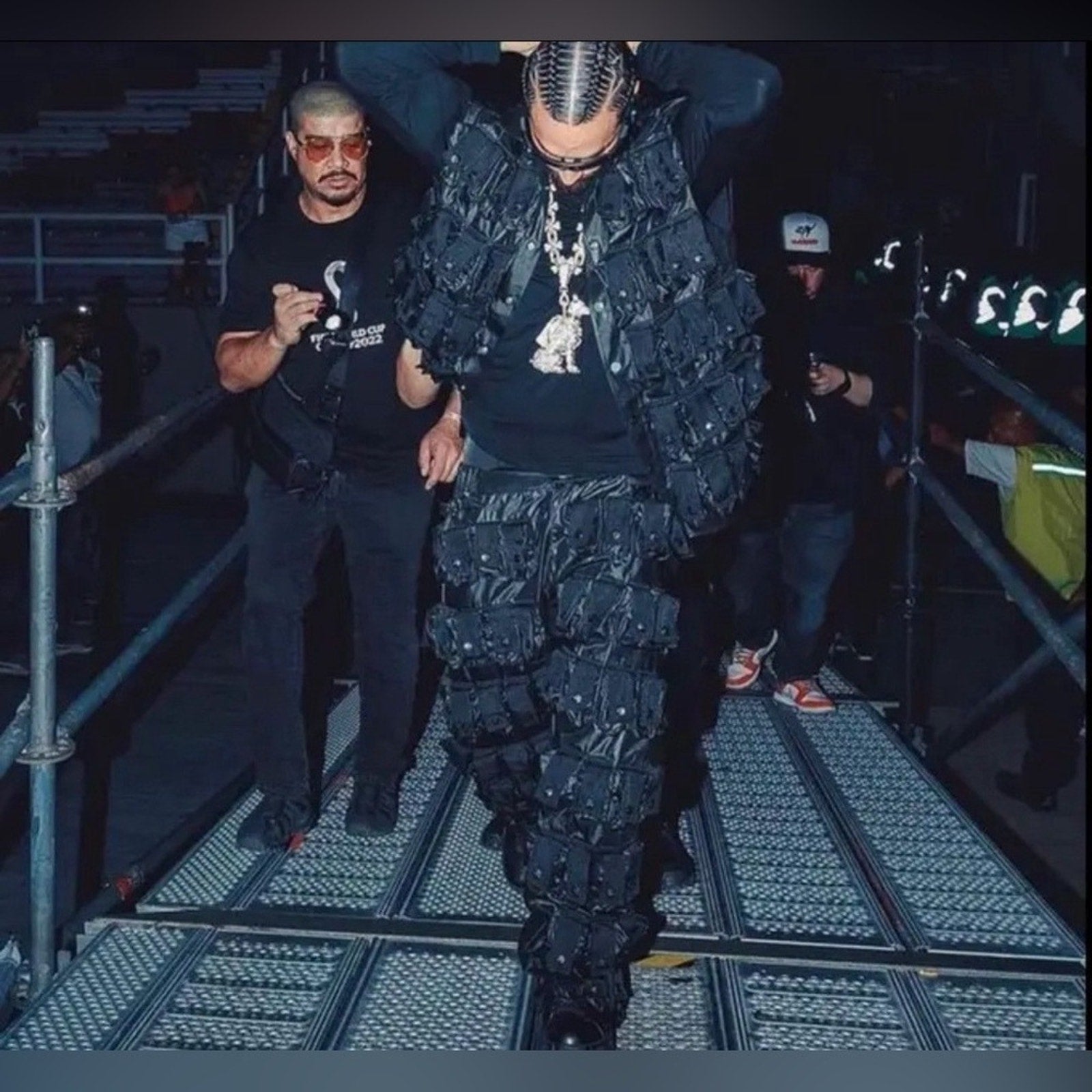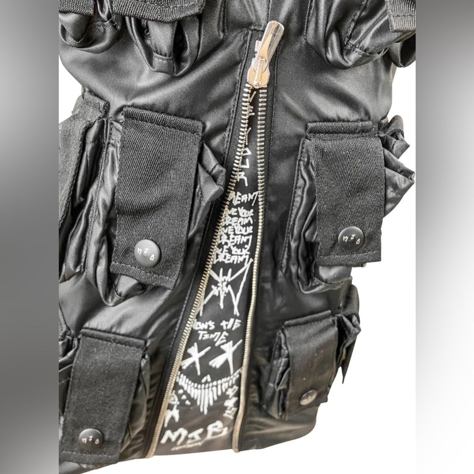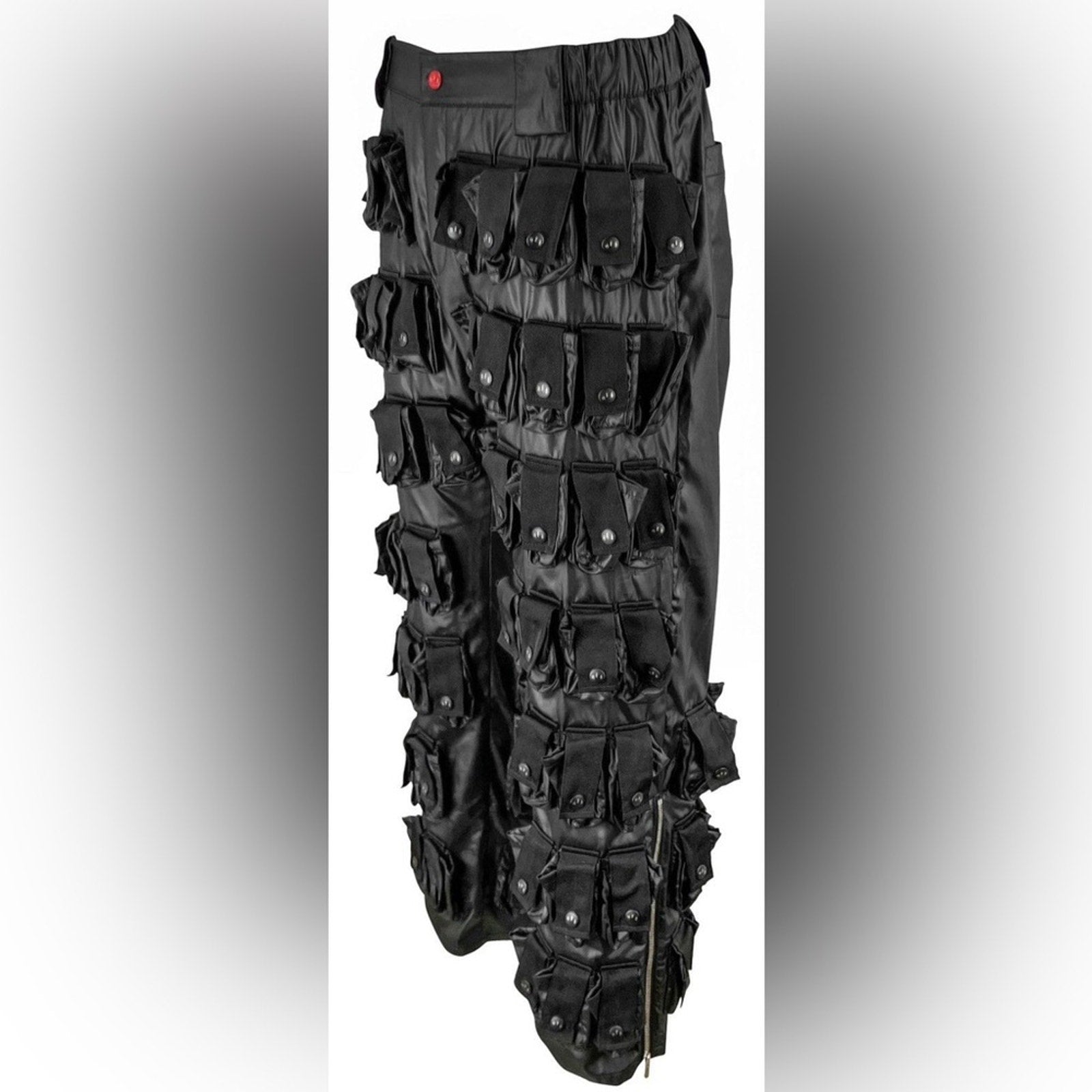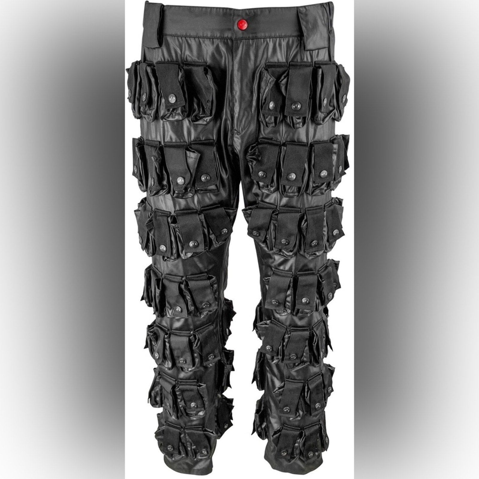 Elastic waistband. Belt loops. Concealed zip fly with button closure. Patch pockets at back. 3-D cargo style flap pockets all over with button closures. Zip closures at hems. Straight leg.