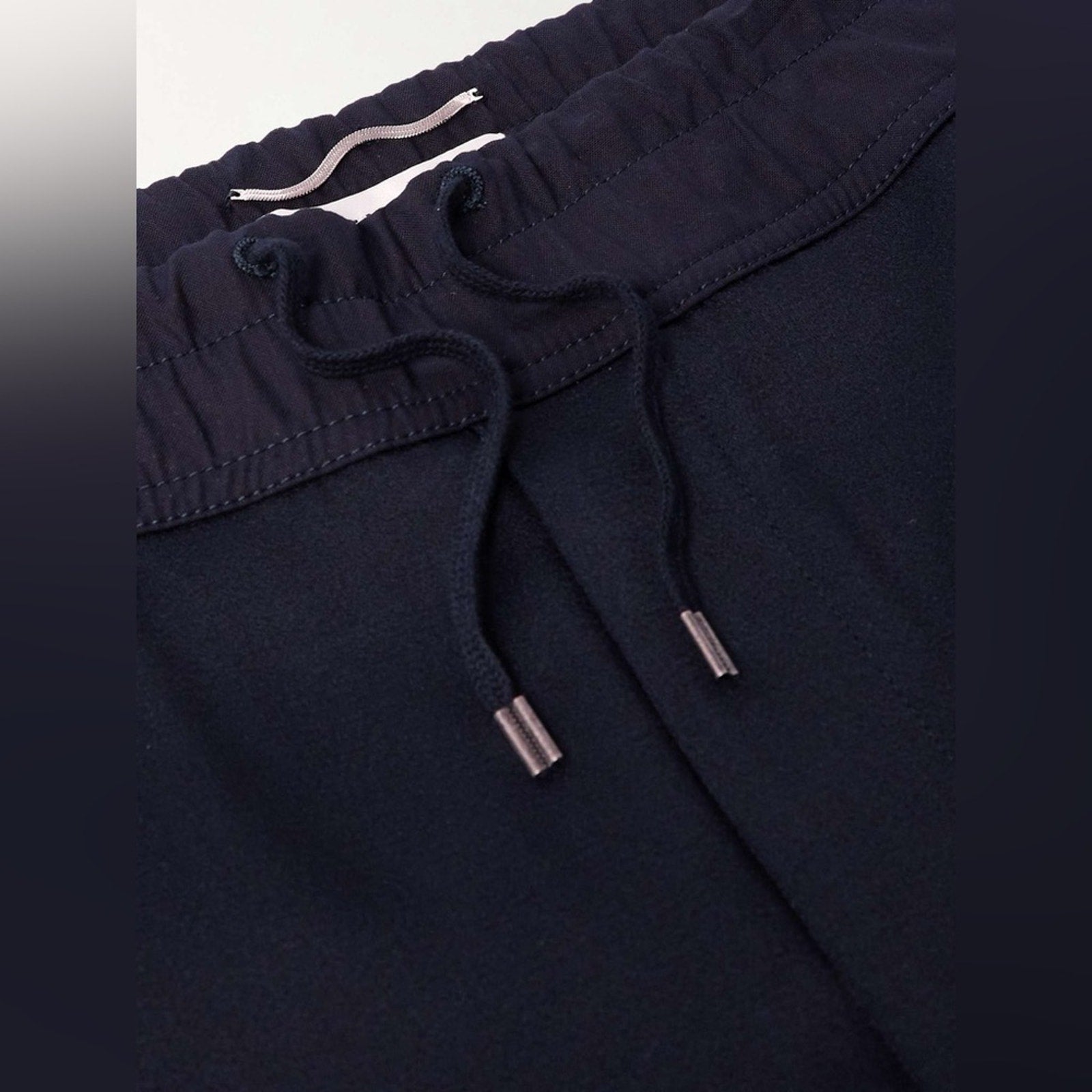 Elastic waistband with drawcord. Side seam pockets. Hidden button fly. Welt pockets at back. Off white striped piping down the sides. Ribbed elastic ankle cuffs.